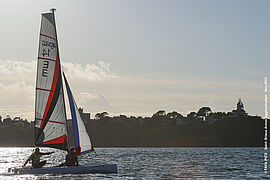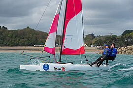 Catamaran de 14 pieds conçu pour les pratiquants à partir de 14 ans. Le spi et trapèzes apportent rapidement des sensations aux navigateurs.